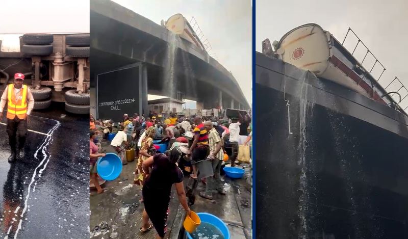 According to a video posted by LASTMA, Nigerians were seen gathering several jerrycans and buckets to gather as much diesel as possible.